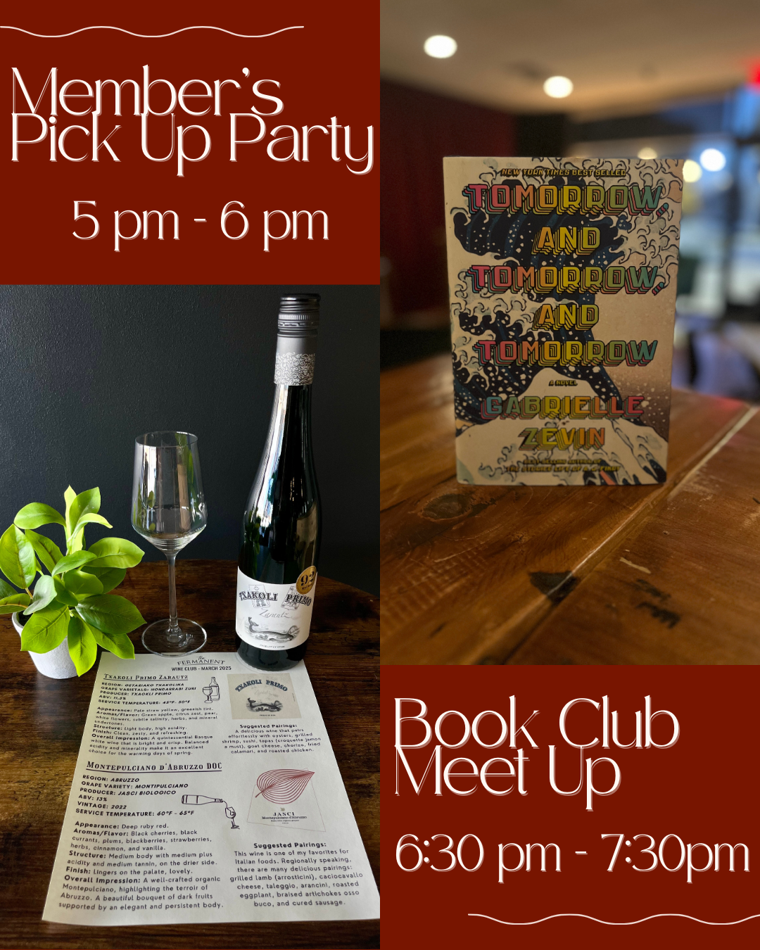 This month’s pick is Tomorrow, and Tomorrow, and Tomorrow, but the night is all about conversation, connection, and good wine — not homework.
