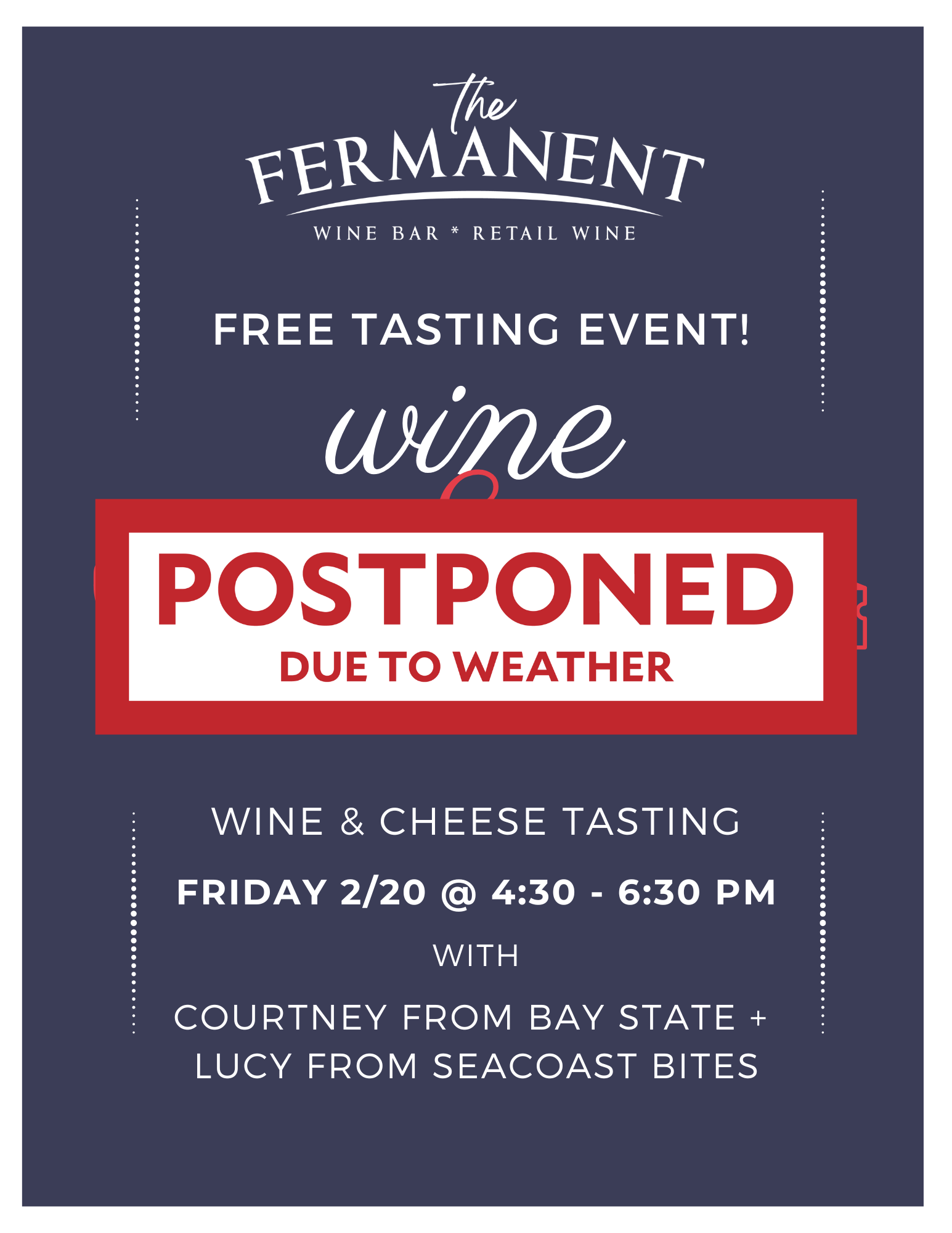 *** Event Postponed due to weather*** Rescheduling for 2/27 | Free Wine + Cheese Tasting with Courtney from Bay State + Lucy from Seacoast Bites