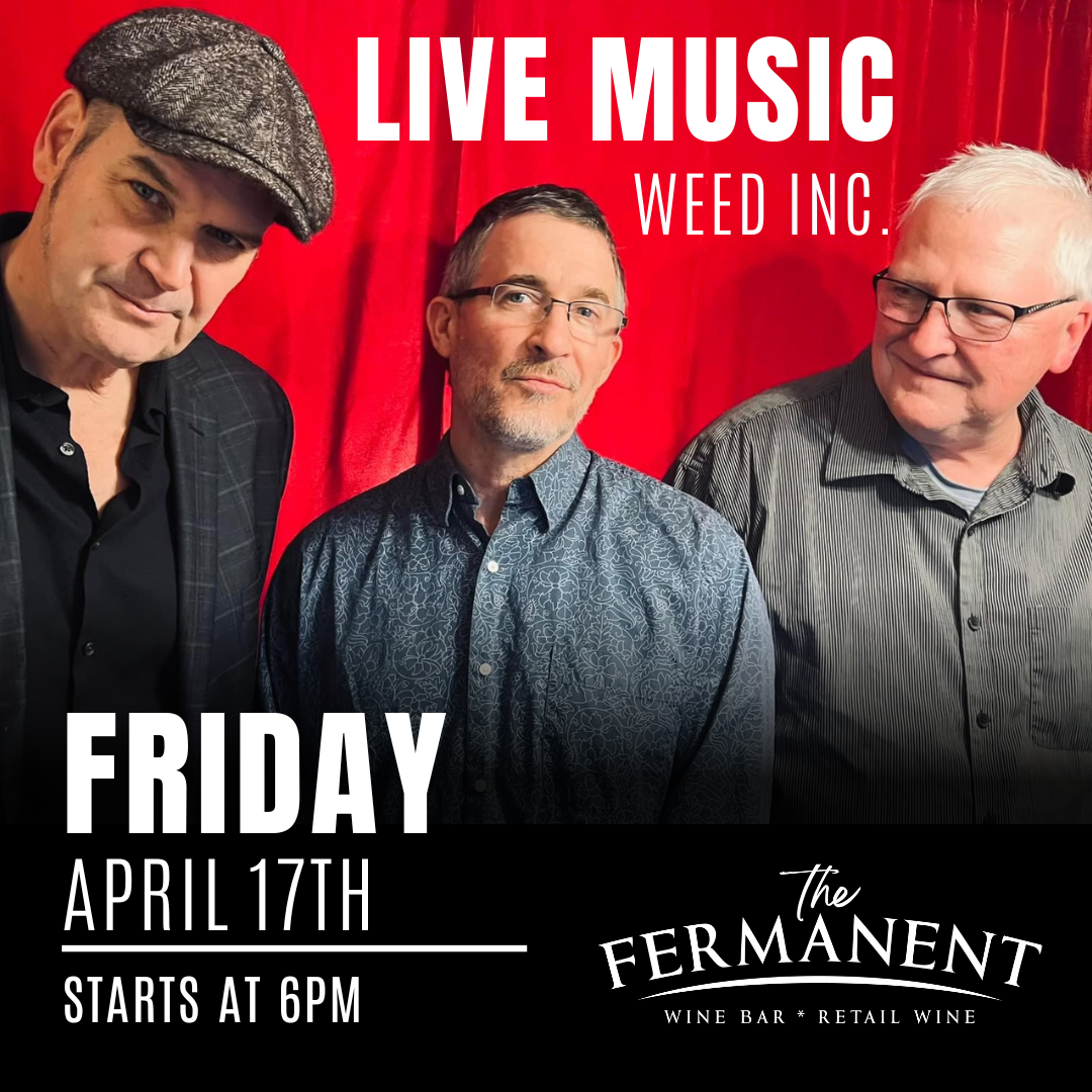 Friday, April 17th from 6–8 PM marks a special night as we host Weed Inc for our final live music event until June. They’re helping us send off this chapter in style—no cover, just great music, wine, and community. Music will take a short pause, but will be back this summer.